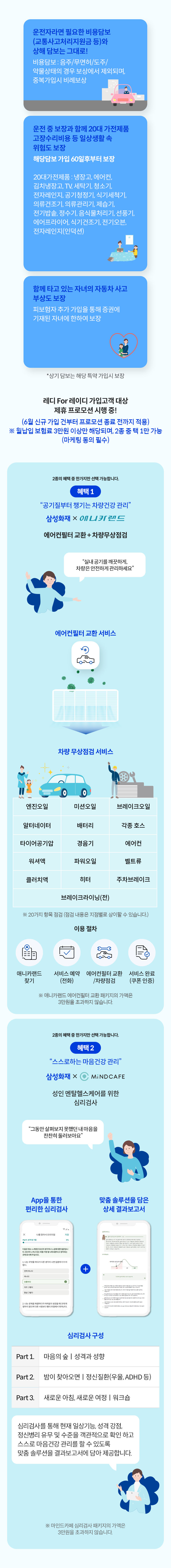 비용담보 : 음주/무면허/도주/약물상태의 경우 보상에서 제외되며, 중복가입시 비례보상 - 운전 중 보장과 함께 20대 가전제품 고장수리 비용 등 일상생활 속 위험도 보장