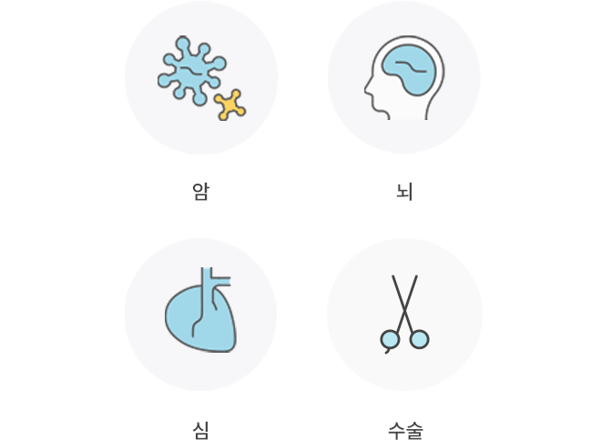 - 주요 질환에 대한 진단비, 수술비, 일당은 물론 사망 및 후유장해를 보장해 드립니다.(해당 특약 가입 시)