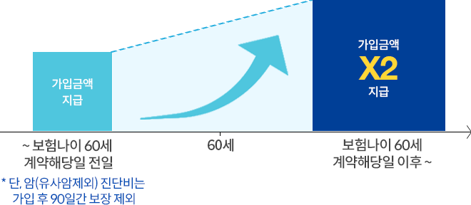 2배를 보험금으로 지급해 드립니다. - (체증형, 60세2배) 암(유사암 제외) 진단비는 최초 계약일 또는 부활(효력회복)일부터 90일이 지난 날의 다음날부터 보장합니다.