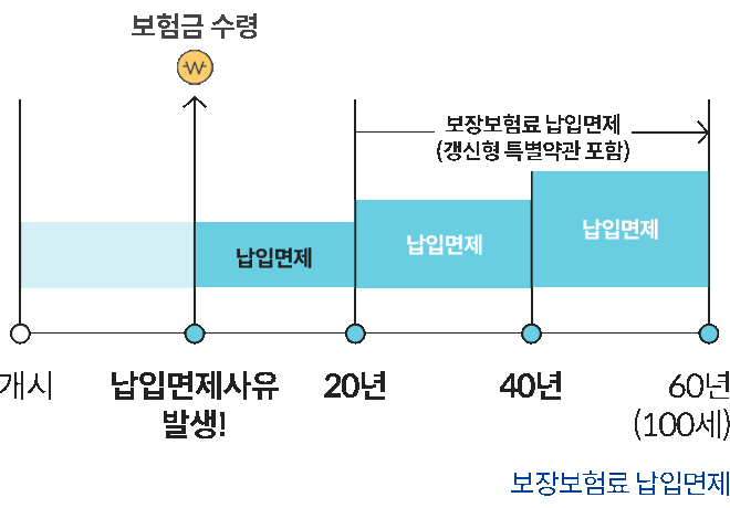 - 20년~60년(100세) 보장보험료 납입면제(갱신형 특별약관 포함)