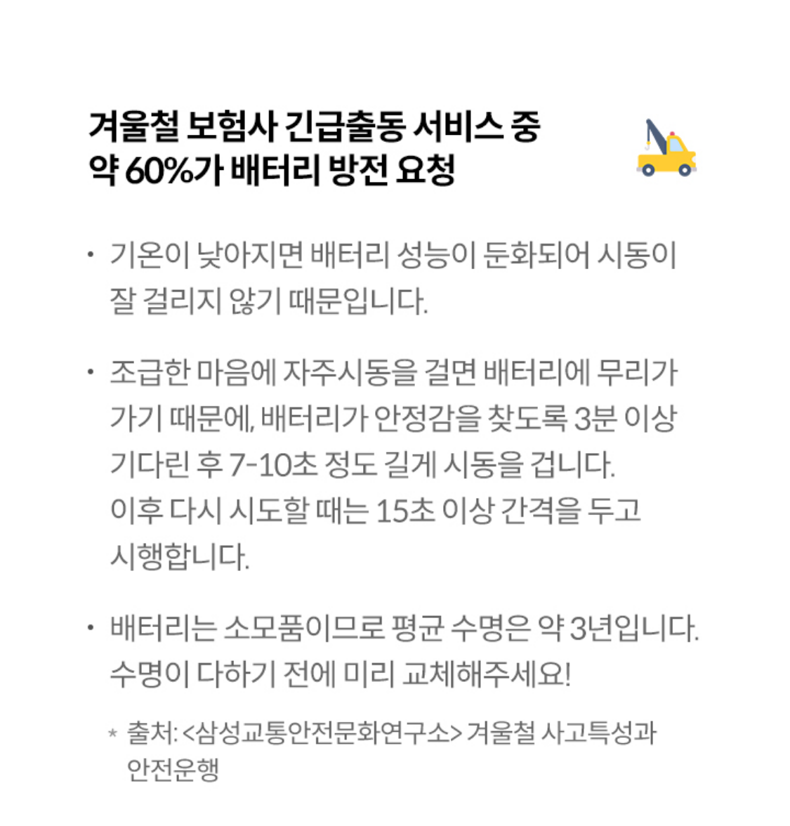 겨울철 보험사 긴급출동 서비스 중 약 60%가 배터리 방전 요청