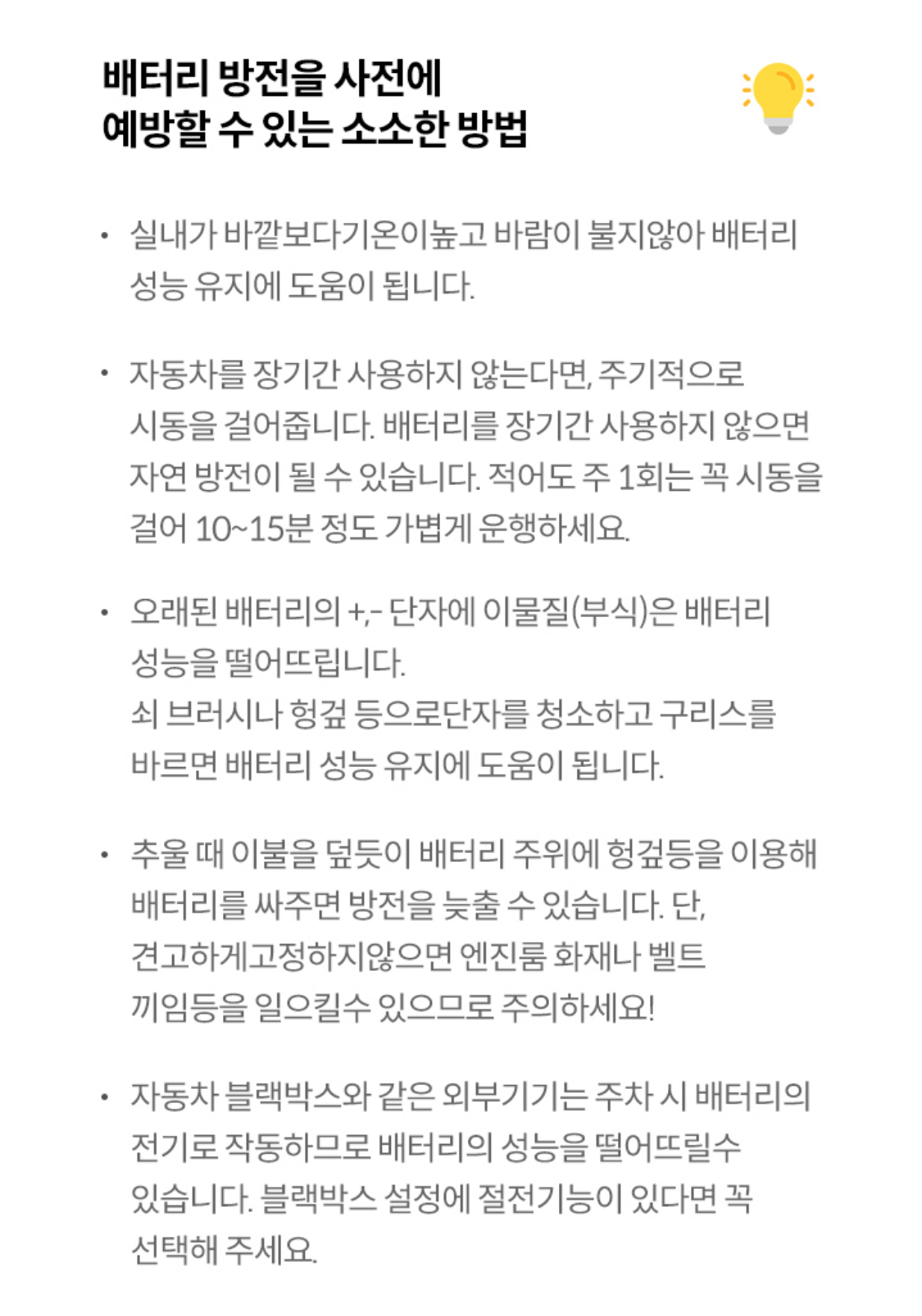 - 자동차를 장기간 사용하지 않는다면, 주기적으로 시동을 걸어줍니다. 배터리를 장기간 사용하지 않으면 자연 방전이 될 수 있습니다. 적어도 주 1회는 꼭 시동을 걸어 10~15분 정도 가볍게 운행하세요.