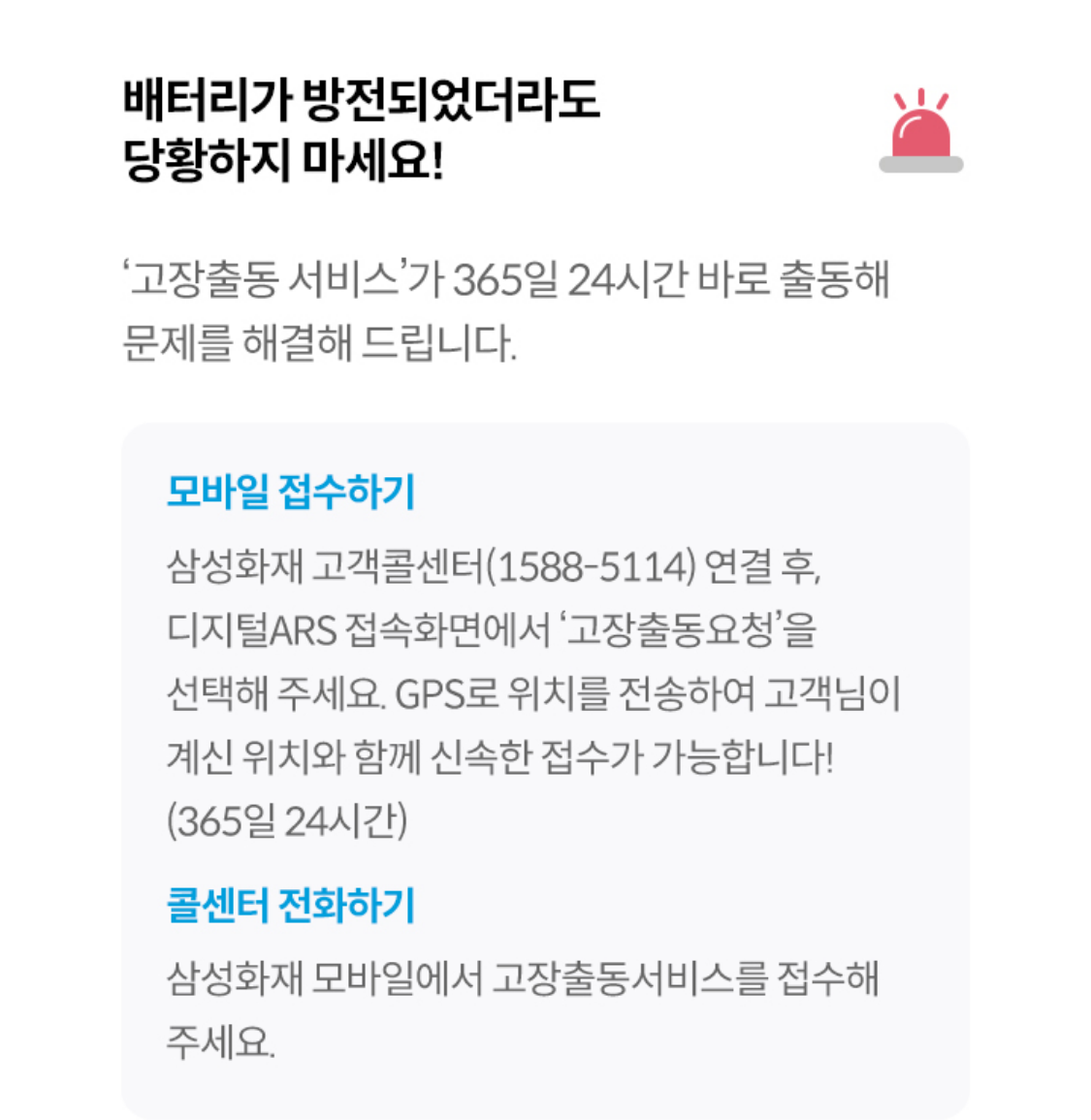 - 삼성화재 모바일에서 고장출동서비스를 접수해 주세요.