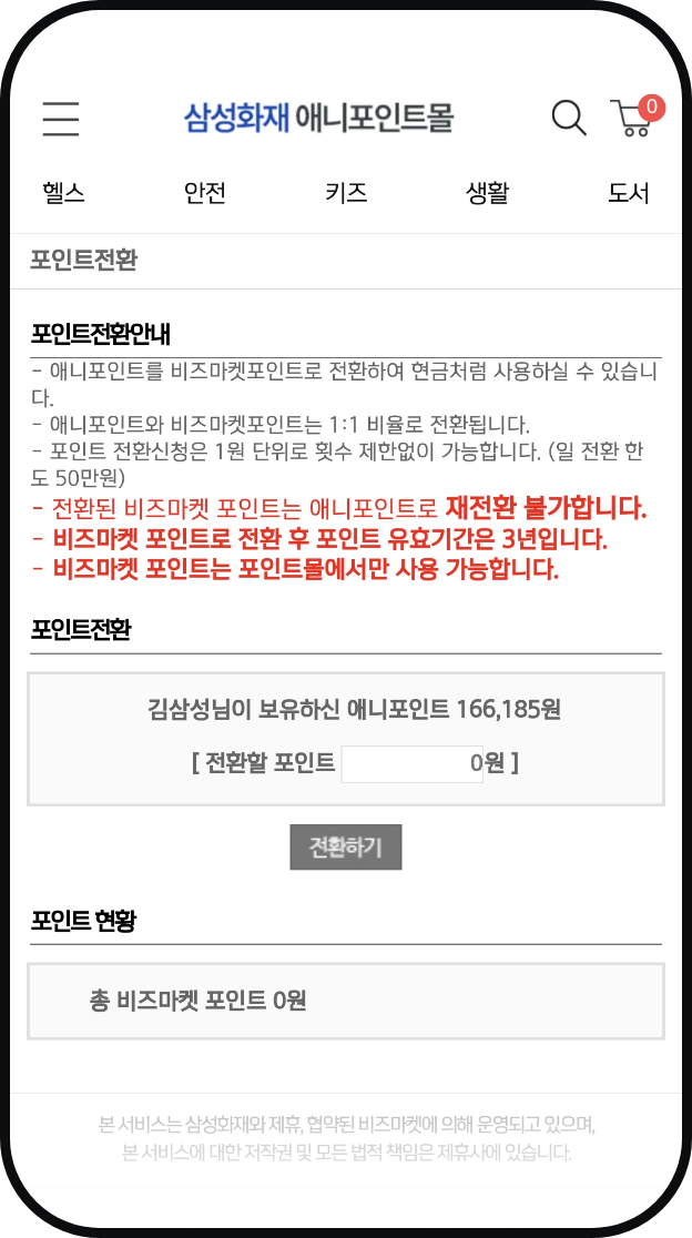 - 2보유 중인 애니포인트를 확인하고 ‘전환하기’를 눌러 비즈마켓포인트로 전환 후 상품 및 서비스 구매(전환된 포인트는 애니포인트몰에서만 사용 가능)